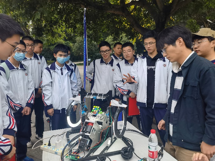 Fun88乐天堂 本科2019级学生金杰、方心、刘邦鸿,向同学们现场演示了解魔方机器人的工作,介绍了魔方机器人的原理、实现过程,该作品在2022年中国大学生智能机器人创意大赛中斩获国家级一等奖。同时也对同学们在课外科技活动中遇到的问题进行了解答,对交大学生科技活动开展情况进行了简要介绍。