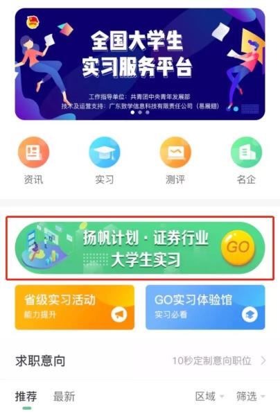 步骤二:点击“扬帆计划·证券行业大学生实习”进入专题页面