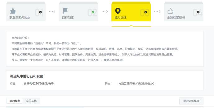 注意:在行业和职位中可以根据自己的兴趣、专业等进行选择以后希望从事的行业、职位,也可自行选择需要训练的能力(至少3项)~