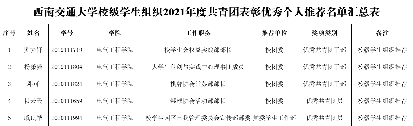 关于西南交通大学校级学生组织2021年度共青团表彰优秀个人拟推荐名单的公示