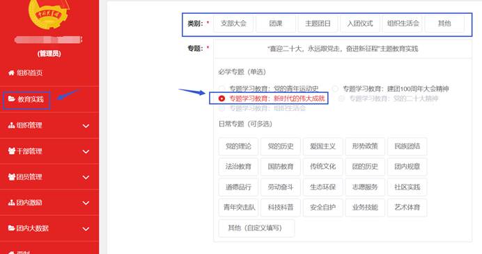 团课和团日活动都需要分别录入到“智慧团建——教育实践”板块内。