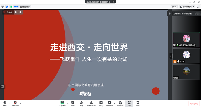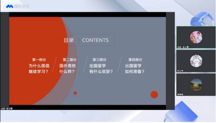 会上,新东方前途出国的谢玉馨老师。谢老师围绕“为什么提倡继续学习?”“国外高校怎么样?”“出国留学有什么收获?”“出国留学如何准备?”这四方面进行了深入讲解。谢老师通过将川内高校国内外深造率进行对比,列举大学生就业去向以及对比国内外研究生平均收入,讲述了出国(境)留学就业的显著优势。随后,谢老师提到,终身学习的能力、独立生活和工作的能力、高度认可的学位、国外工作的机会等都可以从出国留学中获得,出国留学收获的不仅仅是知识,还有平台。最后,谢老师向同学们介绍了出国留学准备的申请规划时间表,以及出国申请资料清单,鼓励有出国留学意向的同学早做准备。