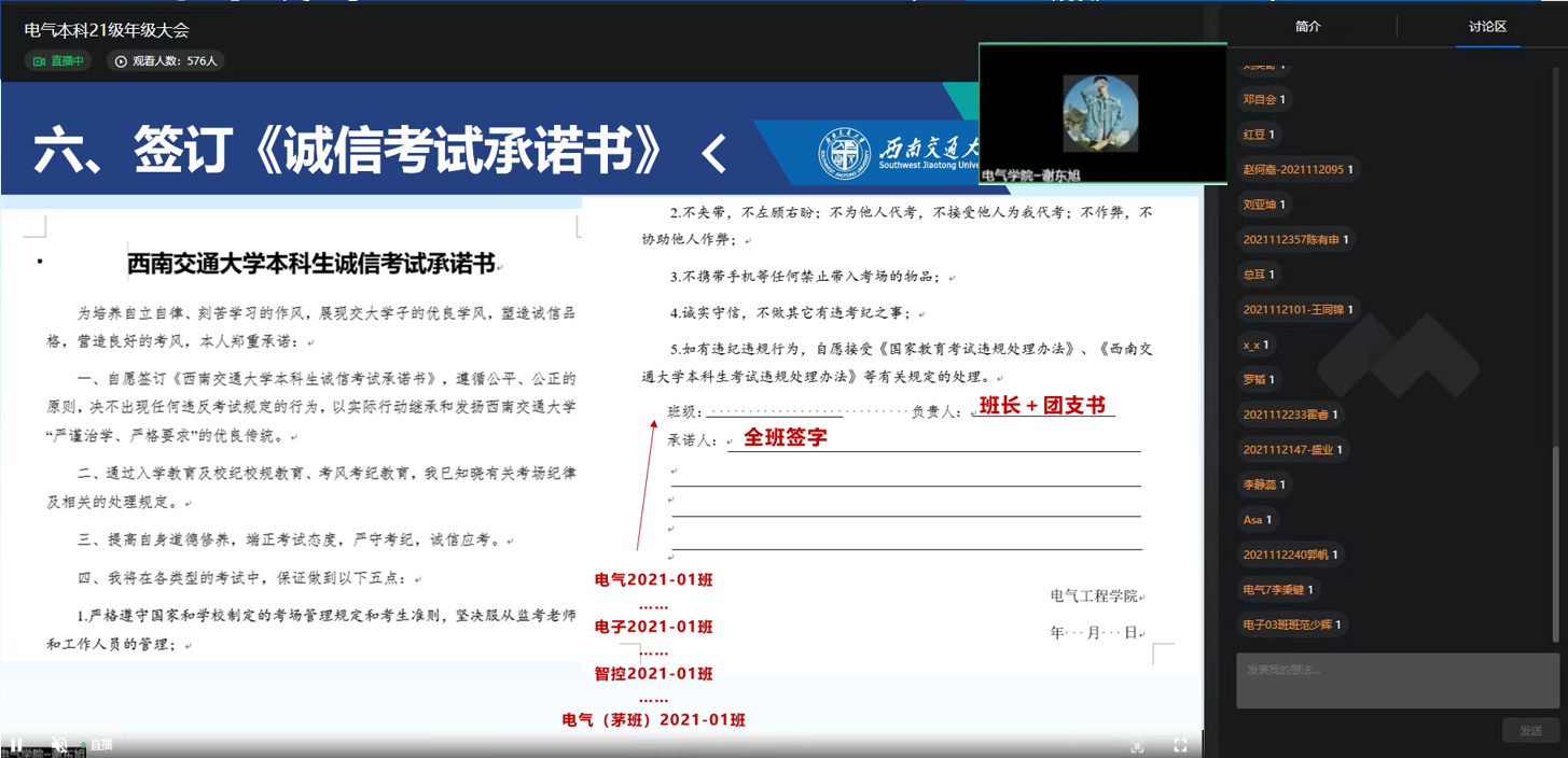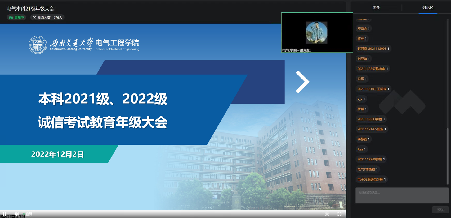 为保证电气本科21级、22级全体同学期末考试顺利进行,Fun88乐天堂 于2022年12月2日晚7点召开本学期期末年级大会暨期末诚信考试教育会。根据《西南交通大学关于做好近期教学工作安排的通知》,Fun88乐天堂 已有部分同学申请了“自愿返乡学习”,为保证会议的效果,本次会议采用了线上进行的方式,本科21级、22级全体同学及辅导员参加。