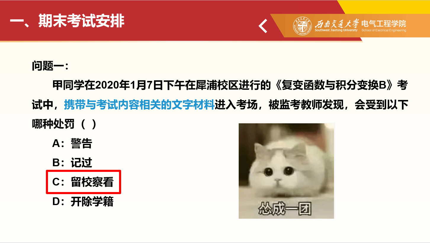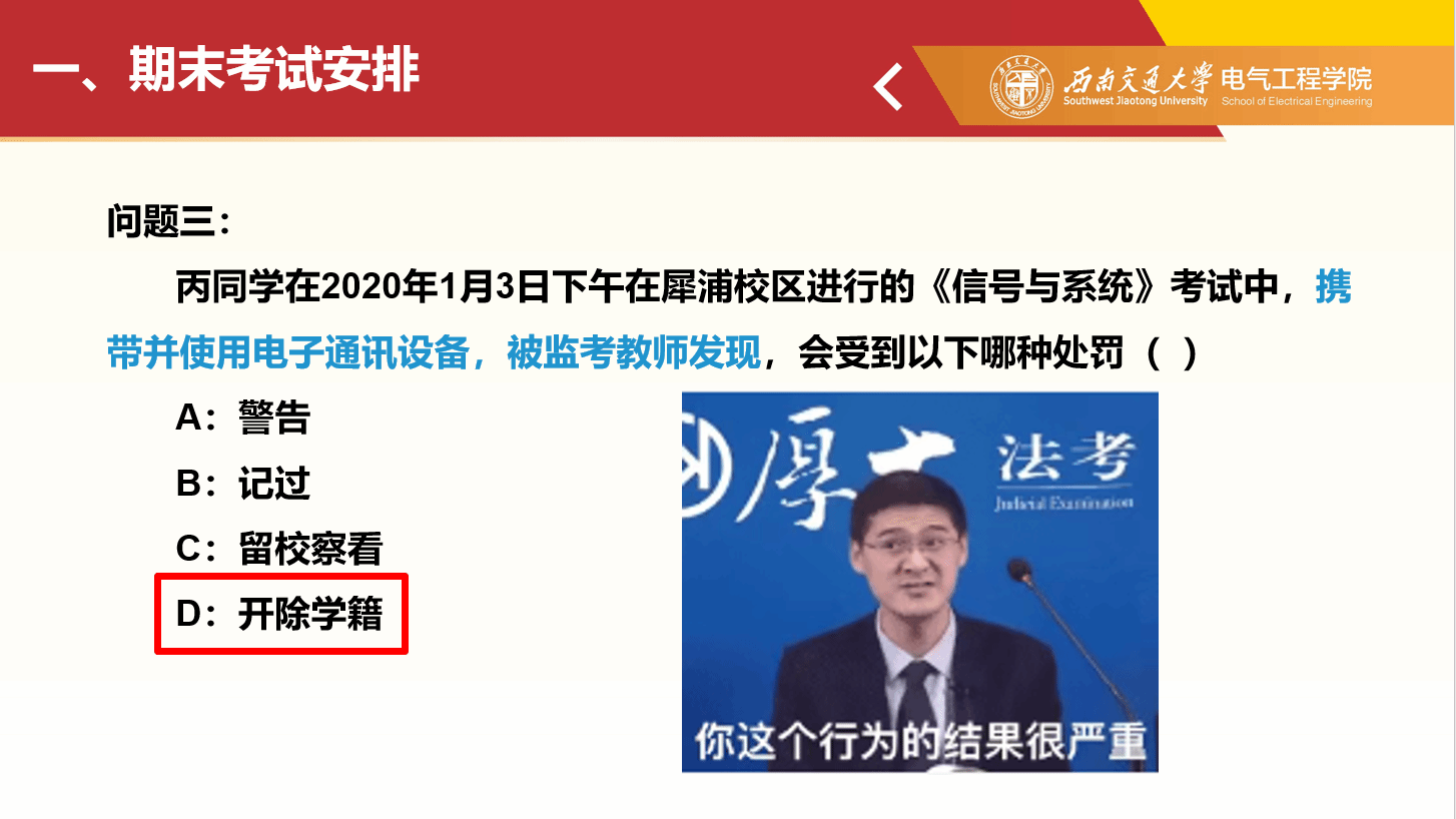 接下来,辅导员老师们通过几道简单的问答题,给同学们强调不诚信考试的严重后果,看似有趣题目的背后都是一个个真实的案例。辅导员老师们还指出学校下达的处分文件将放入个人档案,对未来的考研、就业和个人发展等造成不可逆转的后果。