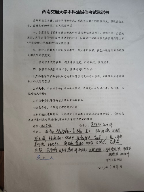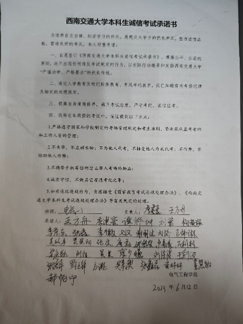 最后,辅导员老师们再一次解读了《学生公寓管理办法》,从违章电气、电信诈骗等角度出发,进一步加强安全教育。年级大会结束后,辅导员老师们组织了全体22级同学共同签订《诚信考试承诺书》阅读一份规则,敲响心里警钟;签署一张协议,许下郑重诺言;信守一次承诺,收获诚信品德!预祝同学们给大一学年划上一个圆满的句号。