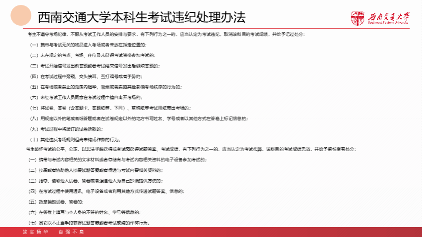 接下来,班长强调了诚信的重要性,指出诚信是一个人品质的象征,是塑造一个人未来的关键因素。诚信不仅仅是在考试中表现,更是一种生活态度,需要贯穿于日常学习生活的方方面面。并带领大家一起研读了《西南交通大学考试规则》以及《西南交通大学本科生考试违纪处理办法》。