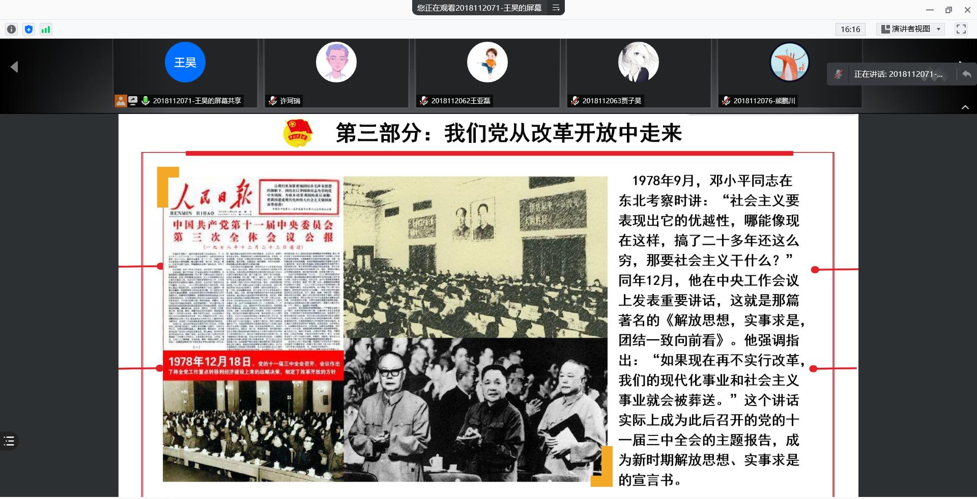 电气2018级8班团支部在线上举办了“学党史、强信念、跟党走,争做新时代有为青年”专题学习会。这次活动按照时间顺序,将党史、新中国史、改革开放史与社会主义发展史以图文并茂的方式展现出来,由团支书徐嘉琪带领同学们一同回顾这段红色的记忆。