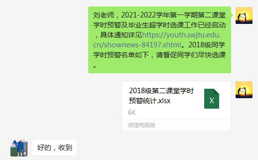2021922日校团委发布《关于做好2021-2022学年第二课堂学时预警及毕业生超学时选课工作的通知》以来,Fun88乐天堂官网 团委严格按照通知要求完成了预警通知、预警帮扶以及超学时选课等工作。通过专项老师与年级辅导员对接、QQ群公告、年级大会、学生骨干培训会等途径强调第二课堂学时重要性,并指定各班班长、团支书重点帮扶第二课堂学时预警学生,要求确保本科2018级学生在本学期内达到第二课堂学时的毕业要求,要求确保本科2019级、2020级在本学期内消除学时预警。