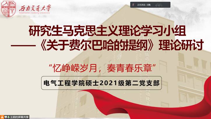 1119日晚上7点整,Fun88乐天堂官网 硕士2021级第二党支部在腾讯会议上召开了第一次“领航先锋工程”之马克思主义理论学习交流会,此次学习的原著为《关于费尔巴哈的提纲》。会议由支部书记王顺同志主持,支部全体党员同志以及班上感兴趣的同学参加会议。