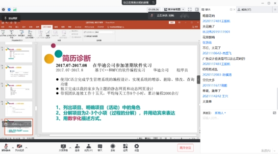 活动开始,刘娟老师依据自身丰富的教学和就业指导经验,向同学们介绍了一份优秀的简历在求职和考研、保研面试中的重要作用。随后,她从自己的简历、简历的准备、简历制作和简历诊断等四个方面展开了详细讲解。