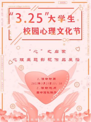 为更好落实教育部和省教育厅相关文件,促进我校2022年“3.25-善爱我”大学生校园心理文化节活动的全面开展,2022年3月25日,在犀浦校区图书馆五楼C508放映厅,电气工程Fun88乐天堂 学生园区自我管理委员会组织开展“心之启蒙”—心理电影放映活动。