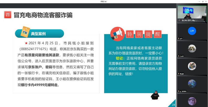 接着,赵警官向同学们讲解了常见的诈骗套路包括网络贷款诈骗、刷单返利诈骗、“杀猪盘”诈骗、冒充电商物流客服诈骗、冒充熟人或领导诈骗、冒充“公检法”诈骗、虚拟投资理财诈骗、虚假购物诈骗、注销“校园贷”诈骗、裸聊、色情链接诈骗等,并逐一分析了各类诈骗的易受骗群体、作案手法、典型案例以及防范手段。