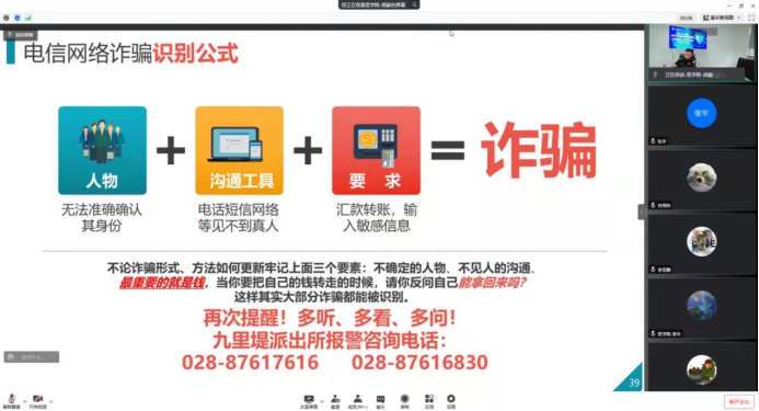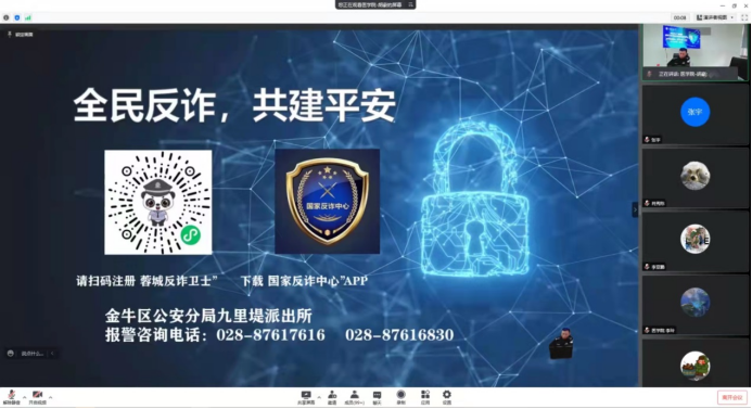 为进一步提升研究生防范网络诈骗的安全意识和防范能力,筑牢校园稳定安全防线,4月14日上午10:00,Fun88乐天堂官网 联合医Fun88乐天堂 面向两院研究生共同举办了反诈防骗教育“专题讲座”,讲座邀请九里堤派出所赵磊警官担任主讲人,通过网络会议形式,结合高校学生群体电信诈骗案例,向同学们宣讲反诈防骗相关知识。