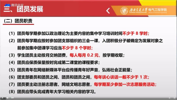 郭冰倩老师还向同学们介绍了共青团员的发展流程,并指出共青团员应该积极参与有关基本政治理论的培训,主动按月交纳团费,在网络新媒体平台应传播青年好声音,弘扬社会正能量。最后,她向同学们介绍了Fun88乐天堂 的团学组织与活动。