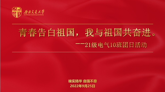 “青年是整个社会力量中最积极、最有生气的力量,国家的希望在青年,民族的未来在青年。”一代人有一代人的使命,为引导青年负起肩上的责任,将一颗爱国心与实际行动结合起来,925日下午,西南交通大学Fun88乐天堂 电气2021-10班团支部书记方镇宵带领团支部全体青年开展“青春告白祖国,我与祖国共奋进”主题团日活动。