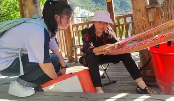 在三关桥附近的一条走廊上,队伍还遇见了一位当地的老婆婆,她正在进行小金特色编织。经过同学们询问,婆婆告诉我们,这是小金县的传统习俗,屋顶上、院子里经常可以看到大家一起织布、织腰带、绣头帕等等。在传统编织样式的基础上,大家还自创了许多新花样,给小金当地生活带来许多乐趣。同学们看着特色编织,再一次感叹劳动人民的巧手和匠心,感受文化技艺的传承和创新。