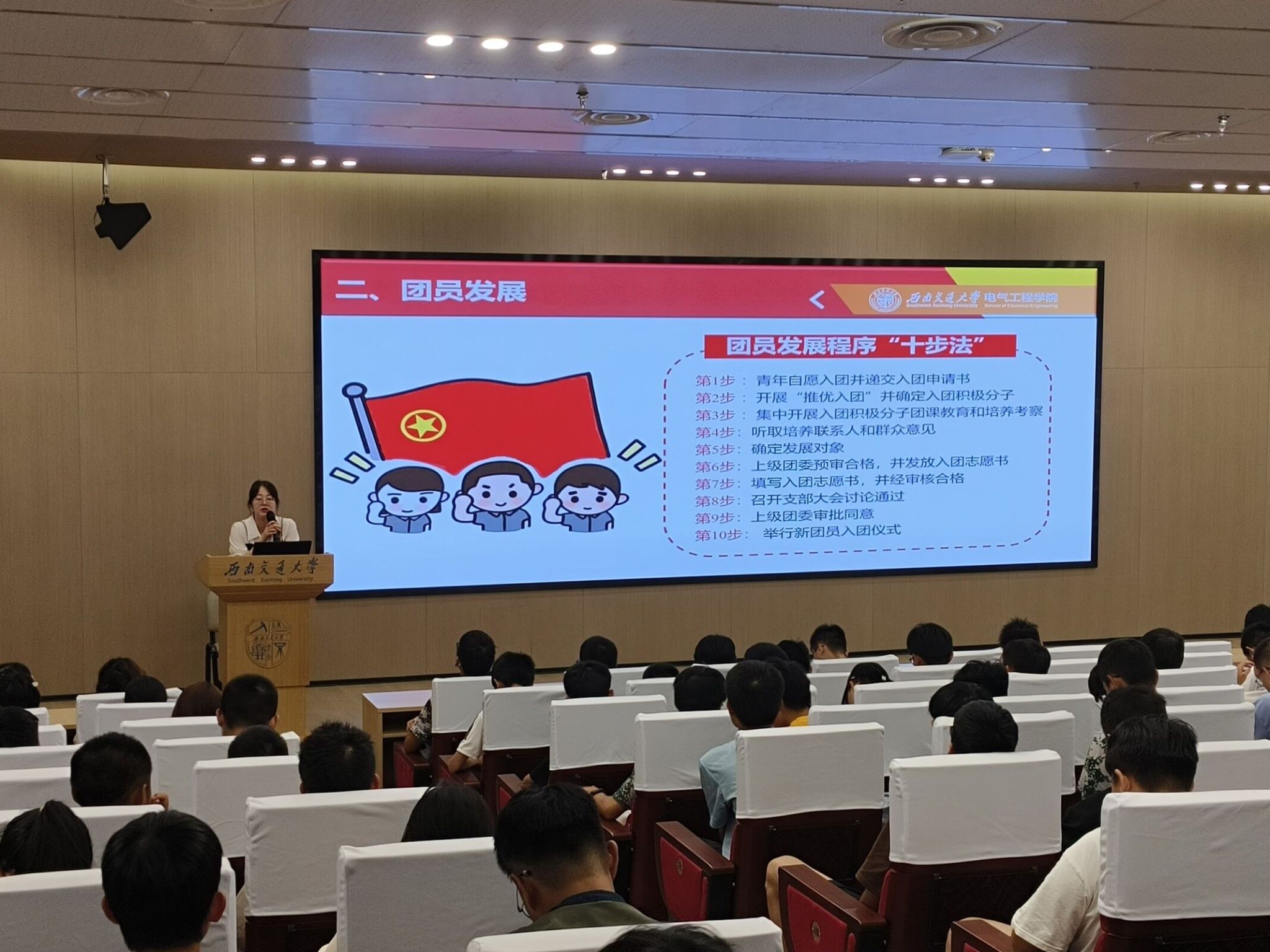 接着,郭冰倩老师重点讲解了团员发展的入团流程与团员职责。团员发展是团的建设的重要组成部分,关乎进步青年入团与先锋团员入党。郭老师强调,团员发展是优中选优的一件事,这对想要入团的青年群众提出了更高的要求,希望各位同学能够积极进取、展现青春风采。