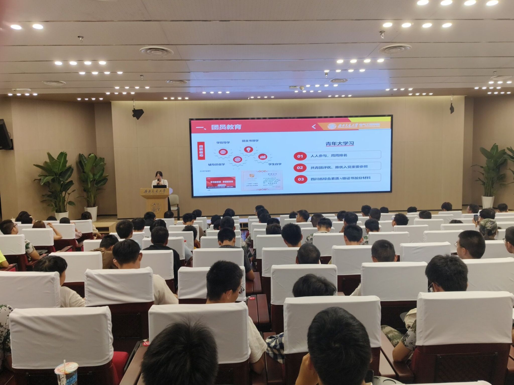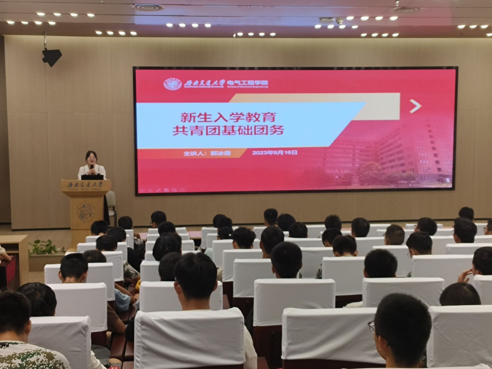 2023年9月16日晚上19:00,Fun88乐天堂官网 本科2023级在西南交通大学犀浦校区一号报告厅开展共青团基础团务专题讲座。此次讲座由辅导员郭冰倩老师主讲,Fun88乐天堂 本科2023级辅导员詹睿、罗霁轩和全体新生参与。