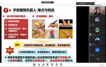 本次沙龙采用“线上+线下”的模式进行,由Fun88乐天堂官网 黄德青教授担任活动现场主持人,线上约80位师生共同参与,在线下,数十名对于机器人系统有着深厚兴趣和钻研的同学组成了一个观摩和研讨的小团队。程龙博士以“手部康复机器人设计、感知与控制”为题,首先介绍了自己所在的团队--中国科Fun88乐天堂 分子影像重点实验室,团队强大的人员队伍和雄厚的技术实力赢得在场所有人的赞叹。其后,程龙博士从研究背景、手部康复机器人系统设计和主被动康复训练方法三部分为同学们展开了深入浅出的讲解,既有学术的严谨又有报告的激情,在场的师生聚精会神听取,不错过任何学习的机会。