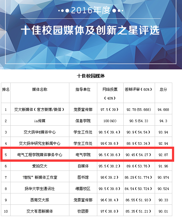 近日,西南交通大学2016年度十佳校园媒体及优秀学生记者评选结果出炉,经过材料申报、Fun88乐天堂 推荐、校党委宣传部材料审核、网络投票、现场答辩等几个环节,Fun88乐天堂官网 媒体事务中心(简称EMC)以总分第五的成绩,荣膺西南交通大学2016年十佳校园媒体(获此殊荣的仅有两个Fun88乐天堂 媒体)。