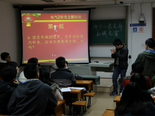 活动进入了下一环节,以党史校史为题目内容的“知识竞答”。支部成员及积极分子们踊跃参加,诸如“申请入党的人,要填写入党志愿书,要有____名正式党员为介绍人”和“2015年是西南交通大学建校的第___年”等问题让同学们在头脑激荡的同时,也进一步对党史校史加深了印象。活动现场气氛热烈紧张,最终陈锡成小组凭借着强大的知识储备与灵敏的反应速度,一举夺魁。