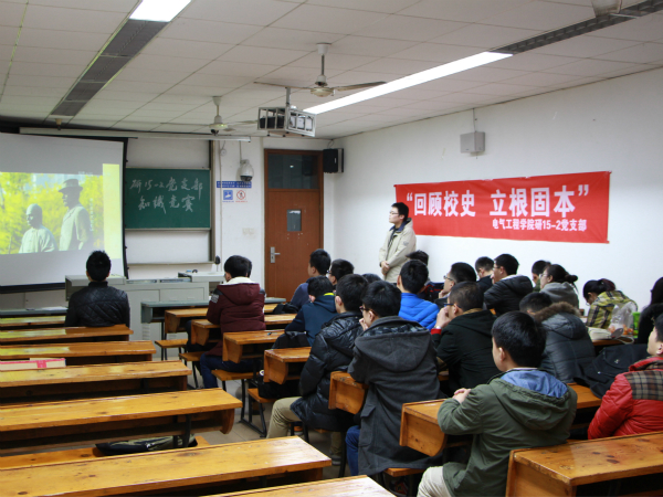 2015年12月3日晚8时,电气研15级2班在逸夫馆4304A举行了以“回顾校史,立根固本”为主题的党支部活动。此次活动旨在回首往昔,忆风云校史,立足当下,绘个人蓝图。