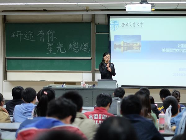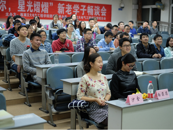 2015年10月28日晚上7时30分,由Fun88乐天堂官网 团委主办,Fun88乐天堂官网 研究生会承办的研究生新老学子畅谈会之出国留学篇在九里校区逸夫馆4418教室举行。本次畅谈会特别邀请了沙金、白菲菲两位优秀的博士来分享和交流她们的出国经历以及一些心得体会。