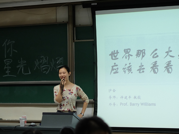 畅谈会开始,研究生会主持人首先简单介绍了两位同学的学术科研成果。然后,由就读于英国斯特拉斯克莱德大学的沙金同学向在座的同学们展示了她在英国学习的环境、学校内的设施以及丰富多彩的业余生活。沙金在讲到国内外研究生教育的差异时表示,虽然国外博士生毕业时没有发表文章的硬性要求,但是博士生学习压力依旧很大,还是要努力学习。接着是就读于美国田纳西大学的白菲菲同学的演讲。白菲菲在介绍了她在美国的学习生活中的一些有趣的事情之后,重点介绍了申请出国留学的一些注意事项,她用自己真实的申请材料给在座的同学们详细讲解了申请材料中应该注意的比较重要的内容。当她提及初到美国时为了得到导师认可的一段经历时不禁落泪,在场的同学们感同身受,纷纷鼓掌鼓励。