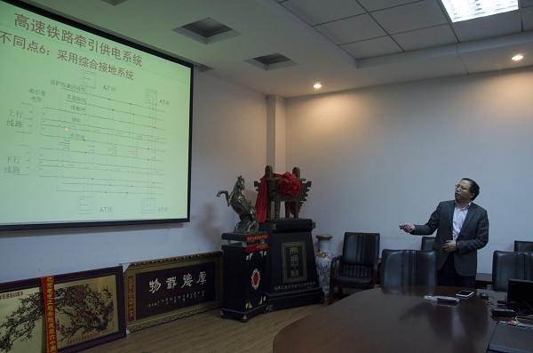 会上,陈书记介绍了高速铁路的发展现状以及高速铁路与普速铁路牵引供电系统的不同之处,并从电分相问题、接触网等方面进行了深入讲解。同时介绍了铁路总公司的“十三五”项目建议,并从应用基础理论研究、关键技术与装备三大方面层层递进,进行了深入剖析。在这个过程中,电子信息支部的老师们不时提出自己的不解之处,积极与陈书记进行交流,他们探讨的问题不乏当前高速铁路发展中的热点问题,例如当前的牵引供电中同相供电的发展等。