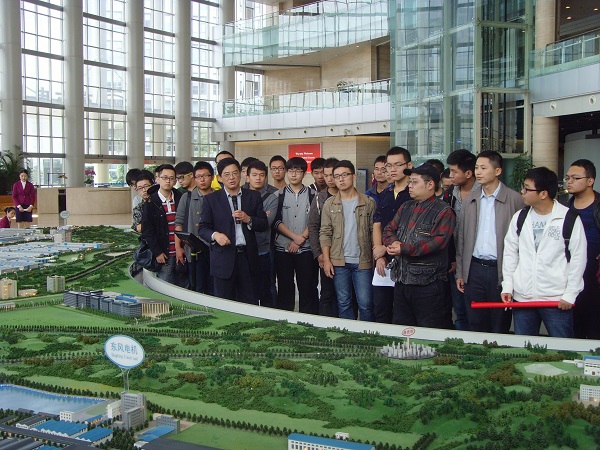 在了解完产业分布情况后,同学们来到了东方电气发展历程长廊,李部长对展墙上的照片以及事迹进行了讲解。一次次关键技术的突破、一个个全新的第一,东方电气50多年来所取得的成就给同学们极大的震撼。随后,映入同学们眼帘的是东方电气各种工程模型,其中包括水电、火电以及核电的工程模型,李部长还特别为同学们演示了火电模型具体工程中的运作原理,使得同学们更好得把理论与实际结合起来。最后一个展示长廊,是国家领导人到东方电气参观慰问以及国外友人到东方电气参观的展示,而这些荣耀更好地证明了东方电气作为中国重装基地在“五电并举”上取得的成就和企业所拥有的价值。