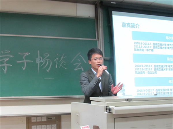 伴随着主持人的开场词,我们的新老学子畅谈会拉开了帷幕。首先上台开讲的是陈小龙师兄。陈师兄本科就是交大人,本科和硕士专业分别是电气工程和控制工程,现已与中广核签约。陈师兄上台便开始传授自己的求职经验,并对各类企业做了大致介绍。陈师兄说道,不同的企业看中的个人素质不同,不同的学子想去的企业也不同,这都是因人而异的。不过师兄强调,作为年轻一代,还是应当以个人发展为首要因素。随后,陈师兄向大家介绍了面试技巧。面试最重要的还是要有坚实的基础,基础好了就不用担心或紧张。面试的关键点大致有以下几点,首先要有自信,不可妄自菲薄。其次,一定要诚实,不可不懂装懂,不会的内容大可直接坦白。除此之外,还要做好准备,一些基本的经典问题一定要有所准备。最后,陈师兄还告诫大家,求职路是一条充满艰辛和打击的坎坷之路。要经得住打击,更要有毅力去坚持下去,当你觉得最累最想放弃的时候,就是离成功最近的时候!