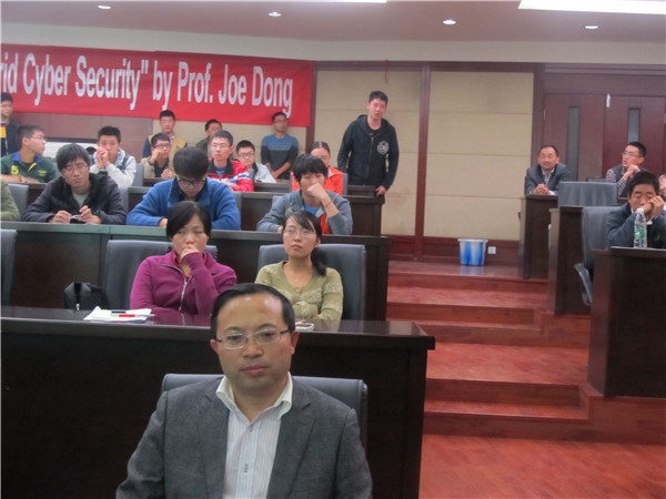 随后,由董朝阳教授开始本次关于智能电网网络安全的专题讲座。智能电网即电网的智能化,又称作“电网2.0”,是未来电网的一个重要发展方向。董教授先就澳洲电网的实际情况作简要介绍,以其项目组所做项目的研究成果为依据,对智能电网网络安全的背景知识以及信息系统安全的可能性进行介绍与分析,并辅之以具体的事例。他提到,智能电网中的信息系统安全更多的是信息物理系统的安全,并且信息系统的安全与电力系统的安全是休戚相关、相互影响的,假设信息系统受到侵扰而致使电力系统网络中某一节点发生故障而无法正常供电,可能会影响与该节点相关的临近节点的功能,如此类推可知当网络中故障节点数达到一定度量的时候,势必引起电力系统网络的崩溃,故而保障信息系统的安全对于智能电网是很关键的。那如何实现信息系统的安全呢?董教授就如何防治实际中存在的概率比较大的安全隐患或攻击,作了较为详细的讲解。