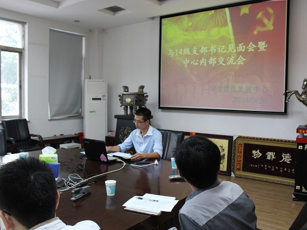 2014年9月29日上午10:00,Fun88乐天堂官网 党支部书记见面会在3211召开,出席会议的有Fun88乐天堂官网 党员发展中心指导老师王轶老师和党员发展中心各级干部,14级各班党支部书记。