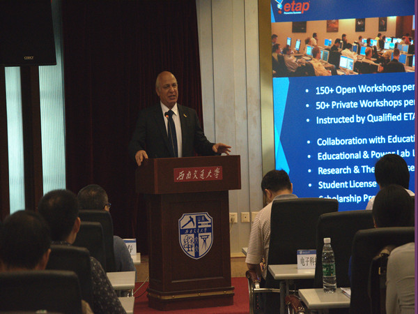 接下来,ETAP集团总裁Farrokh Shokooh先生做演讲。Farrokh Shokooh先生上台的第一句“你好”,拉近了和与会者间的距离,并称赞西南交大所在的成都是“Beautiful City”。而后Farrockh博士以英文的方式对ETAP集团作了简要的介绍,让与会人员对其集团特色有了更形象的了解,比如Global Presence-localized(Translated in 7 languages)、7Cs of ETAP(Serving for Customers)等集团和产品特点。最后,Farrockh博士用一句“谢谢”结束了他的讲演。