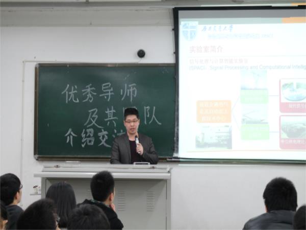 在主持人做了简短的介绍之后,交流会正式开始。首先,王青元老师介绍了列车控制与牵引传动研究室。王老师主要讲述了该实验室的研究方向、已完成和正在进行的科研项目、实验室的软硬件设备以及毕业生的工作去向,充分向同学们展示了冯老师团队的硬件基础与科研实力。接着,曹晓斌老师对由吴广宁教授带领的高电压试验室进行了介绍。高电压实验室主要从事高电压与绝缘技术领域的试验研究,并承担本科生、研究生的教学实验任务,目前承担着国家自然科学基金、铁道部、四川省等多项科研项目。最后,韩志伟老师与同学们分享了信号处理与计算智能实验室的情况。韩老师提出如果无论你擅长理论研究还是软件设计亦或是动手能力较强,在刘志刚老师的团队都可以找到与之相应的方向进行研究与锻炼。