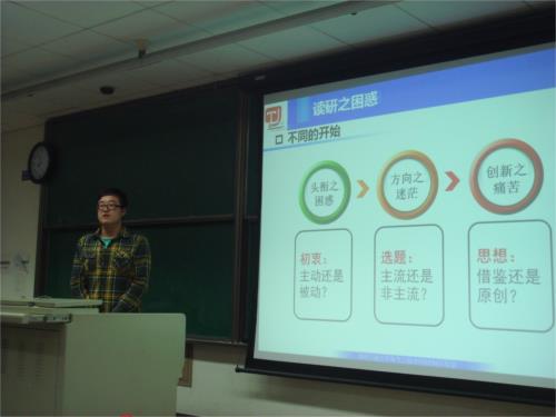 在主持人慷慨激昂的介绍中,本次围绕国家奖学金专题的畅谈会正式开始。首先,由姜晓锋学长给大家分享相关经验。学长就“什么是国奖”,“读研的困惑”,“个人奋斗元素”三个方面给大家做了详细介绍。针对于大多数新生对于国家奖学金申请的不了解,师兄首先详细的给大家介绍了什么是国奖,申请国家奖学金的步骤以及资格。国家奖学金是教育部和财政部颁发给具有创新、科研、学术的优秀研究生和博士生的奖学金。那怎样才能成为一名优秀的研究生呢?据此,师兄进一步为大家讲解研究生学习生活中可能会遇到的困惑、问题以及解决方法。接着,给大家对于未来奋斗道路提出了几点有效的建议及警告。告诉大家要明确自己的身份、处理好与周围老师、同学的关系、主动虚心的学习。