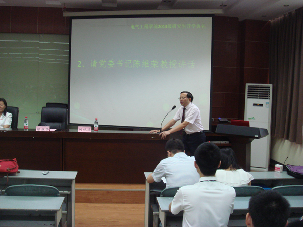 典礼的第一项议程为全体起立,奏唱国歌,嘹亮的歌声拉开的典礼的第一幕。陈维荣书记首先为大家讲话,陈书记表达了对13级研究生新生的热烈欢迎,并向各位13级新生介绍了Fun88乐天堂 的发展历史以及基本情况,陈书记着重介绍了Fun88乐天堂 近几年丰硕的科研成果,用事实告诉了13级新生作为“电气人”应有的自豪。在场的同学们也被陈书记感染,为Fun88乐天堂 的辉煌成就热烈鼓掌。