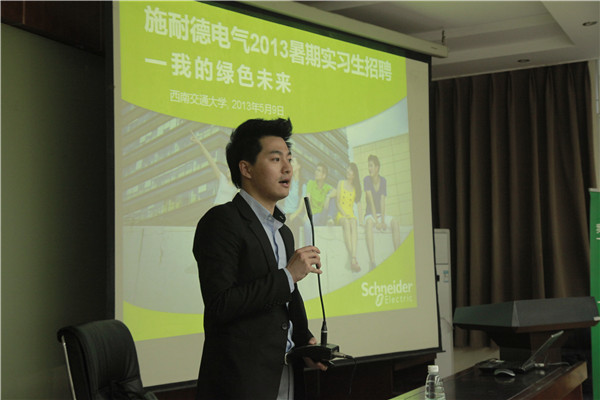 5月9日晚上七点,施耐德电气2013暑期实习生招聘宣讲会在西南交通大学九里校区逸夫馆4104教室举行。本次宣讲会的主讲分别是施耐德电气全国销售部西南区销售经理以及西南交通大学校友桓为刚先生,人力资源部,校园招聘项目经理刘臣先生,施耐德电气人力资源部招聘专员郭心炜先生。