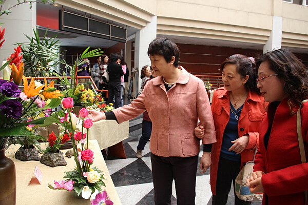 在论坛开始前,会场外已经布置成了插花的世界,“雅韵芳华——女教职工插花作品展”给所有人奉上了视觉盛宴。交大的老师心灵手巧,将不同品种的花利用色彩,空间上的搭配,组合出各式各样的艺术作品,令人赏心悦目。