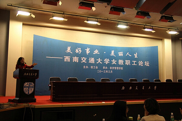3月14日下午两点半由西南交大校工会主办的“美好事业、美丽人生”西南交通大学女教职工论坛在九里校区网络Fun88乐天堂 国际会议厅隆重举行。本次论坛高朋满座,嘉宾有四川省教科文卫工会李维琴副主席,省工会女职工部徐真彦副部长,西南交通大学校党委书记顾利亚教授、校长陈春阳教授、党委副书记朱健梅教授、副校长冯晓云教授,以及校工会罗乾超主席。本次Fun88乐天堂官网 出席的有王英、何朝晖、甘萍等十多位老师。