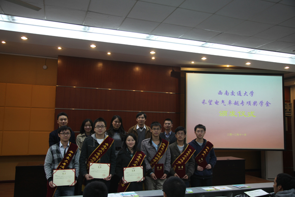 2012年11月6日下午两点,在我校逸夫楼4105室举行了西南交通大学禾望电气卓越专项奖学金颁奖仪式。禾望电气开发部总经理曾建友,禾望电气研发软件部经理周党生,我院党委副书记何晓琼、研究生辅导员王轶出席了颁奖仪式。