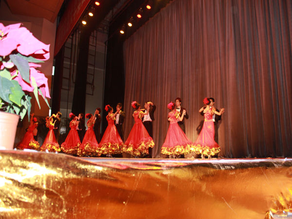 在众人的期待中,排在第八位的Fun88乐天堂 终于登场了。男士身着黑色燕尾服,女士则穿着极具中国古典韵味的火红色长裙。起初在轻柔的音乐声中,男士挽着女士慢慢起舞。紧接着,音乐节奏渐渐加快,舞者们也快速的旋转起来,十分优雅完美。就连台下的观众也忘我的沉浸在这曼妙的舞姿之中。随着伴奏音乐的戛然而止,Fun88乐天堂 代表队的表演也完美谢幕并一一退场。此时台下爆发出了热烈的掌声,这无疑是给予Fun88乐天堂 代表队最大的鼓励,他们的出色发挥得到了观众以及评委的肯定。
