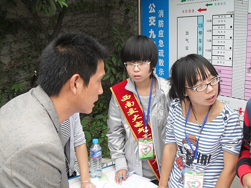 本次服务的主要内容分为站台服务,便民服务和公交车出行安全例行检查。站台服务主要负责疏导乘客和引导乘客安全乘车,防止乘车时出现扎堆拥挤情况。站台服务分为两个地点,它们是九里堤公交站和会展中心。由于假期购物的市民很多,而56路公交车经过上西顺城街、盐市口等市中心站台,会格外拥挤。但是,在志愿者们辛苦的引导下,乘客们有序排队,有效维护了乘车秩序和方便了公交车安全发车。便民服务则负责为在九里堤公交站乘车的乘客提供换零、问路服务,并且向乘客无偿发放由Fun88乐天堂官网 青年志愿者协会自编的“九里堤公交站乘车路线”等宣传资料。而公交车出行安全例行检查是在公交车发车前,志愿者上车检查安全锤是否配齐,灭火器是否完好等工作。