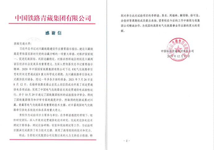 2021年12月17日,西南交通大学收到中国铁路青藏集团有限公司发来的感谢信。信中表示,西南交通大学协同中国铁路青藏集团有限公司参与攻关国铁集团立项的《电气化铁路牵引变电所双边贯通试验》重大科学课题,在Fun88乐天堂官网 李群湛教授科研团队的全力参与和积极配合下,圆满完成试验任务,特此表示感谢,并对参与此次试验项目的李群湛、易东、周福林、解绍锋、徐可佳、余俊祥等课题组成员提出表扬。