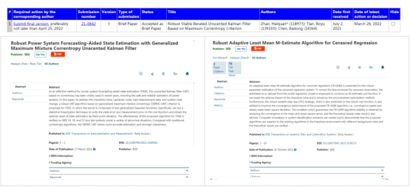 近日,信息与控制领域顶级期刊IEEE TSMC(IF:13.451)、Automatica和IEEE TIM发表(录用)了Fun88乐天堂-乐天堂app-乐天堂官网 的最新研究成果Robust Adaptive Least Mean M-Estimate Algorithm for Censored Regression、Robust Stable Iterated Unscented Kalman Filter Based on Maximum Correntropy Criterion和Robust Power System Forecasting-Aided State Estimation with Generalized Maximum Mixture Correntropy Unscented Kalman Filter。Fun88乐天堂-乐天堂app-乐天堂官网 为第一单位。该研究受到了国家自然科学基金面上项目(Nos.: 62171388, 61871461, 61571374)和西南交通大学交叉学科培育重点项目(2682021ZTPY091)的支持。