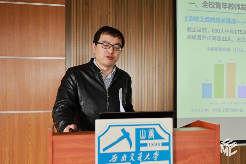 接着,胡海涛对青年教师的工作情况进行了具体分析。首先,他概括了全校青年教师的发展状况,分别从形势政策、基本情况、科研情况、职称分布、晋升情况以及人才情况进行分析。随后,他提到人才发展规律,指出关心年轻人是人才发展强校战略的重要举措,只有更多地关注青年教师,他们才能更有干劲,更能担当中国铁路建设的重任,更能挑起Fun88乐天堂 发展的大梁。之后,他总结了青年教师发展面临的困境:未融入团队、研究方向不契合、无青年基金、无实验设备场地等困难。对此,他提出了Fun88乐天堂 的举措与建议:Fun88乐天堂 人才工作组要给予青年全方位的服务,发布师资、人才招聘信息,接受海内外优秀教师、博士/博士后求职简历,加强海外优青、海外青年博士的联系引进工作,切实保障新进青年、专职博士后的交流和帮扶工作,同时确保引进人才的科研、招生、办公场地等事宜。最后他希望通过Fun88乐天堂 的支持帮助,青年教师能够激发内在动力,未来能够更好地发展。