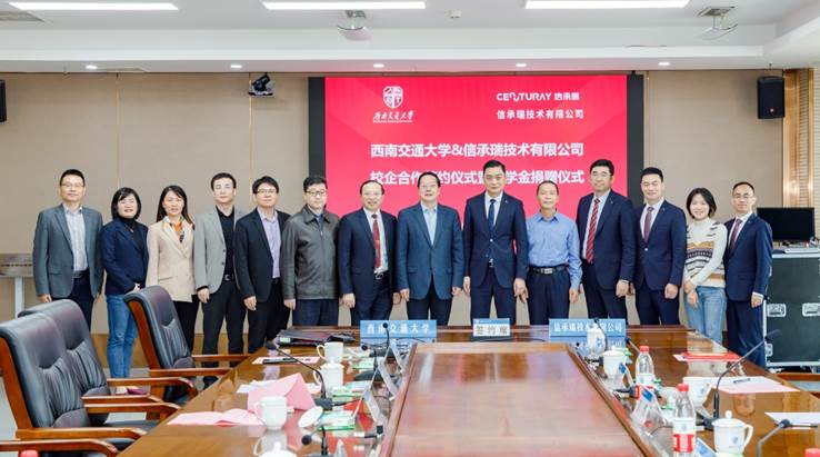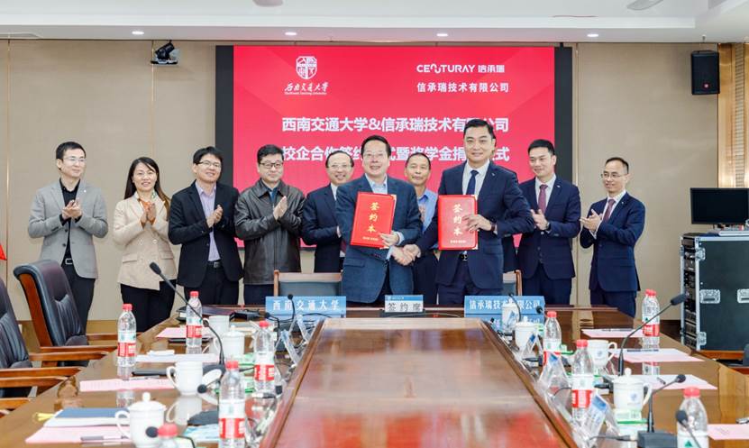 在随后举行的“信承瑞奖学金”捐赠仪式上,沈火明副校长与金良赞总裁共同揭牌,沈火明副校长代表西南交通大学赠予信承瑞技术有限公司捐赠证书,并合影留念。