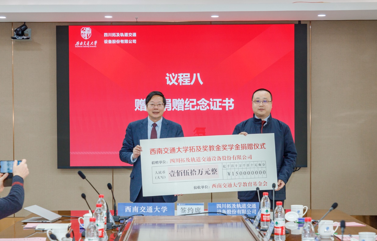 随后,在参会人员的共同见证下,校企双方代表沈火明副校长、张双云董事长签署校企合作协议,沈火明副校长、张向浩总经理签署奖教金奖学金捐赠协议。沈火明副校长代表西南交通大学赠予四川拓及轨道交通设备股份有限公司捐赠证书,并合影留念。
