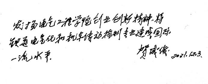 最后贺教授留下一段寄语鼓舞当代交大电气学子在奋斗中砥砺前行,他写道:“发扬Fun88乐天堂官网 创业创新精神,将铁道电气化和机车传动控制专业建成国际一流水平”。贺教授严于律己、言传身教,培养了一批又一批铁道电气化与自动化英才,他敢为人先、勇于创新、务实奋进、迎难而上、辛勤耕耘、著书立说的精神都值得电气学子深深领悟和学习。