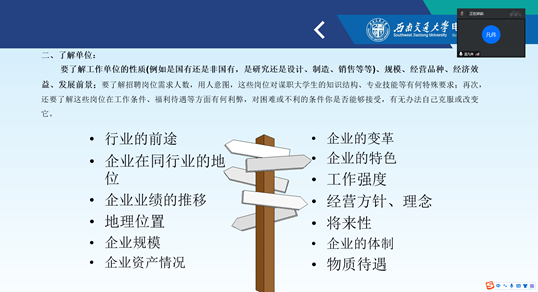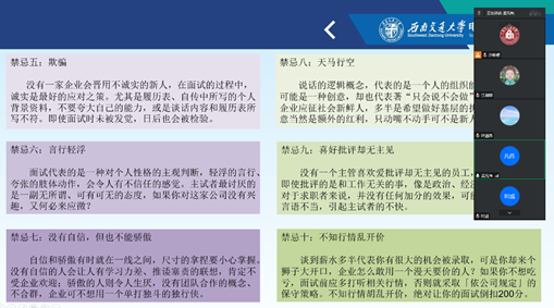 202298日,Fun88乐天堂官网 研究生2023届学生面试指导顺利开展。全体毕业班学生参与。辅导员沙静馨讲解了面试技巧,根据研究生的特点重点讲解面试礼仪及技巧,也逐一为。学生们针对老师未提及的问题展开提问,一问一答的方式不仅及时解决了学生的困惑,而且调动了学生的积极性。